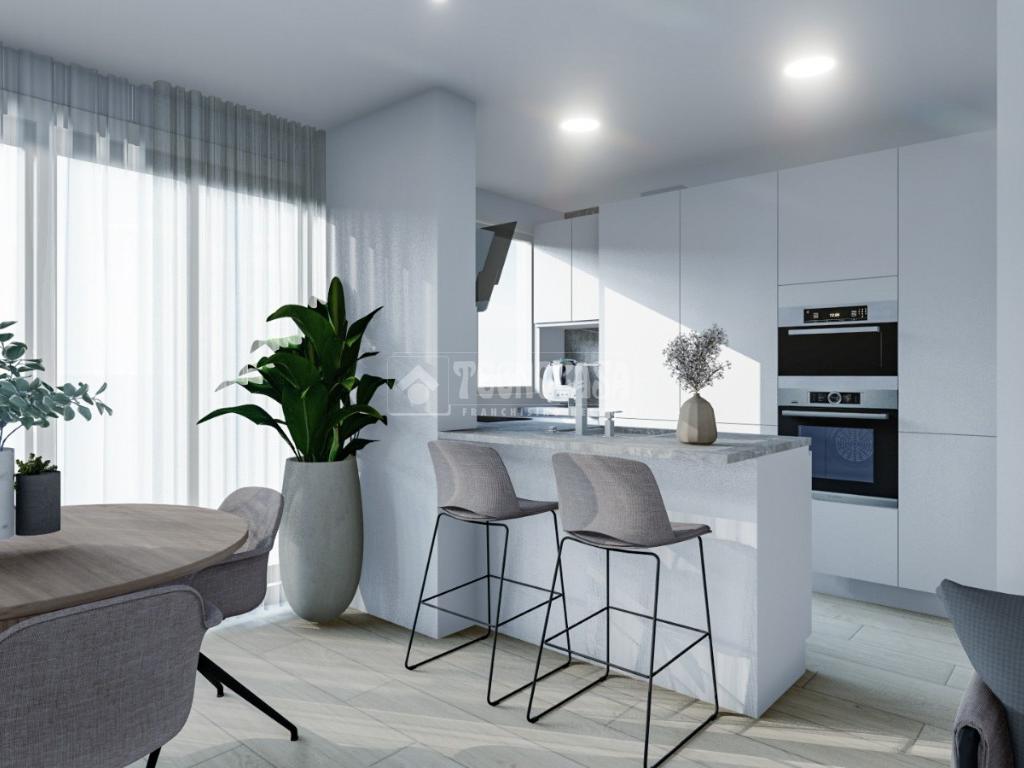 La cocina es uno de los puntos fuertes del piso: moderna, funcional, con barra para desayunos, muebles blancos y encimera de calidad, siguiendo la línea de diseño actual.